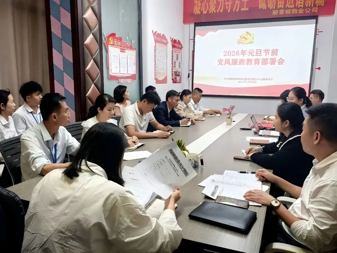 丽景城物业公司召开“元旦”节前党风廉政教育部署会。党支部书记、总经理胡晓滢主持,公司经营班子成员、中层以上管理人员、全体党员、主管参加会议。